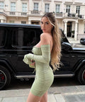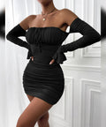 Fashion Slim Off-shoulder Long Sleeve Dress Sexy Tie Pleated Short Dresses Womens Clothing