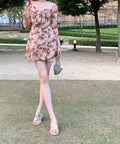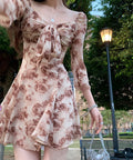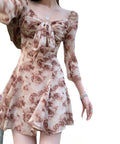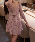 Purple Square Collar Floral Chiffon Women's Long Sleeve Printed Waist-controlled Elegant Dress