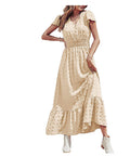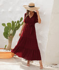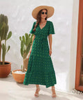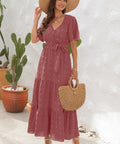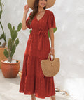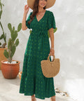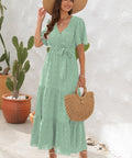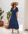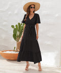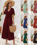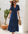 Summer V-neck Short Sleeve Dress Fashion Fur-ball Design Tied High Waist Long Long Dresses
